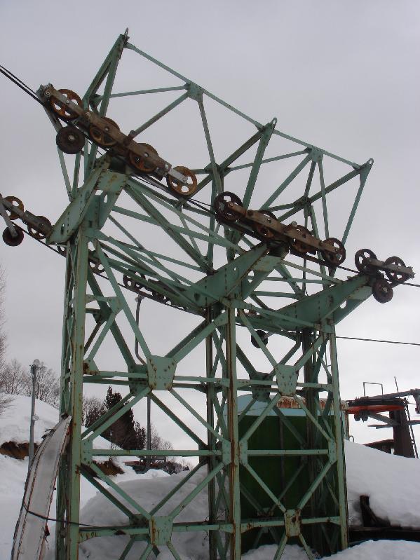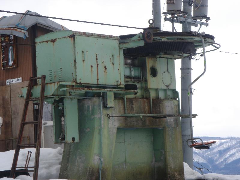 ドライブプーリー直後のプーリー郡吊腰掛を架けているロープが掛かっている鉄柱